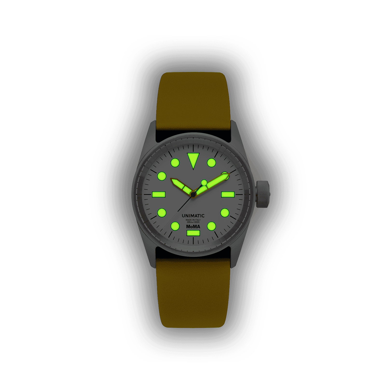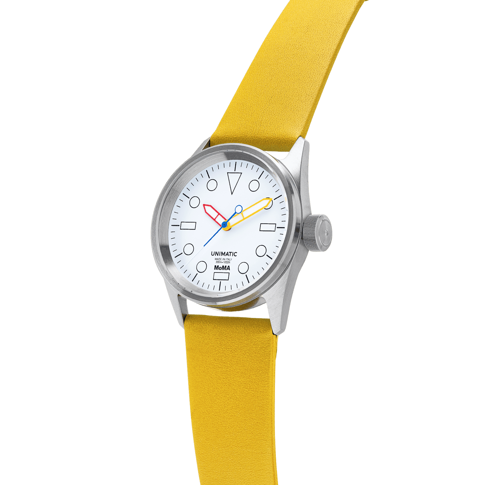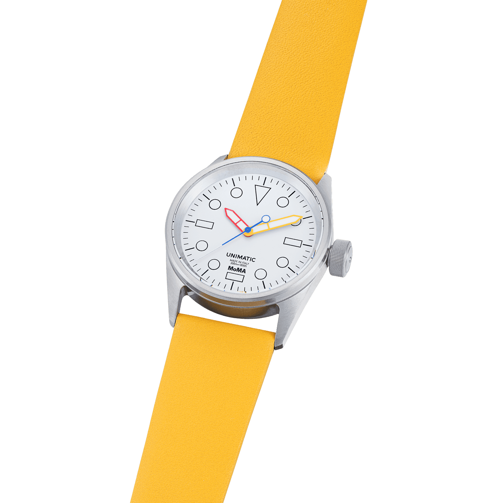 It comes on a primary yellow leather quick-release two-piece strap with stainless steel brushed hardware signed UNIMATIC and an extra black tapered quick-release two-piece TPU strap. The caseback features UNIMATIC x MoMA engraving and the individual progressive number. The watch is covered by a 24-month worldwide warranty and is part of a unique edition of 75 pieces.