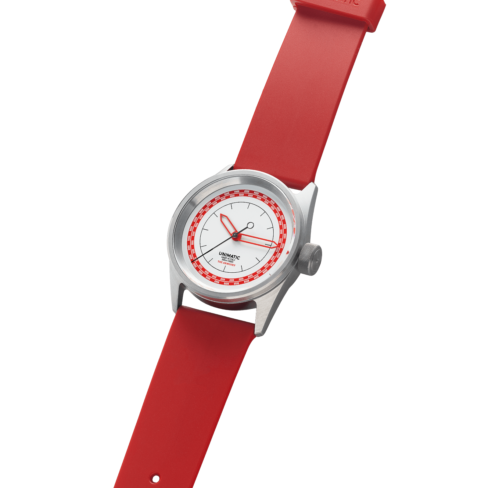 Accuracy is driven by the Swiss Sellita SW200-1 automatic movement, tuned to 28,800bph with a 38-hour power reserve and hacking seconds. The watch comes with a red tapered TPU quick-release strap and an extra black suede top-stitched strap with brushed stainless steel UNIMATIC hardware (22 mm lugs).