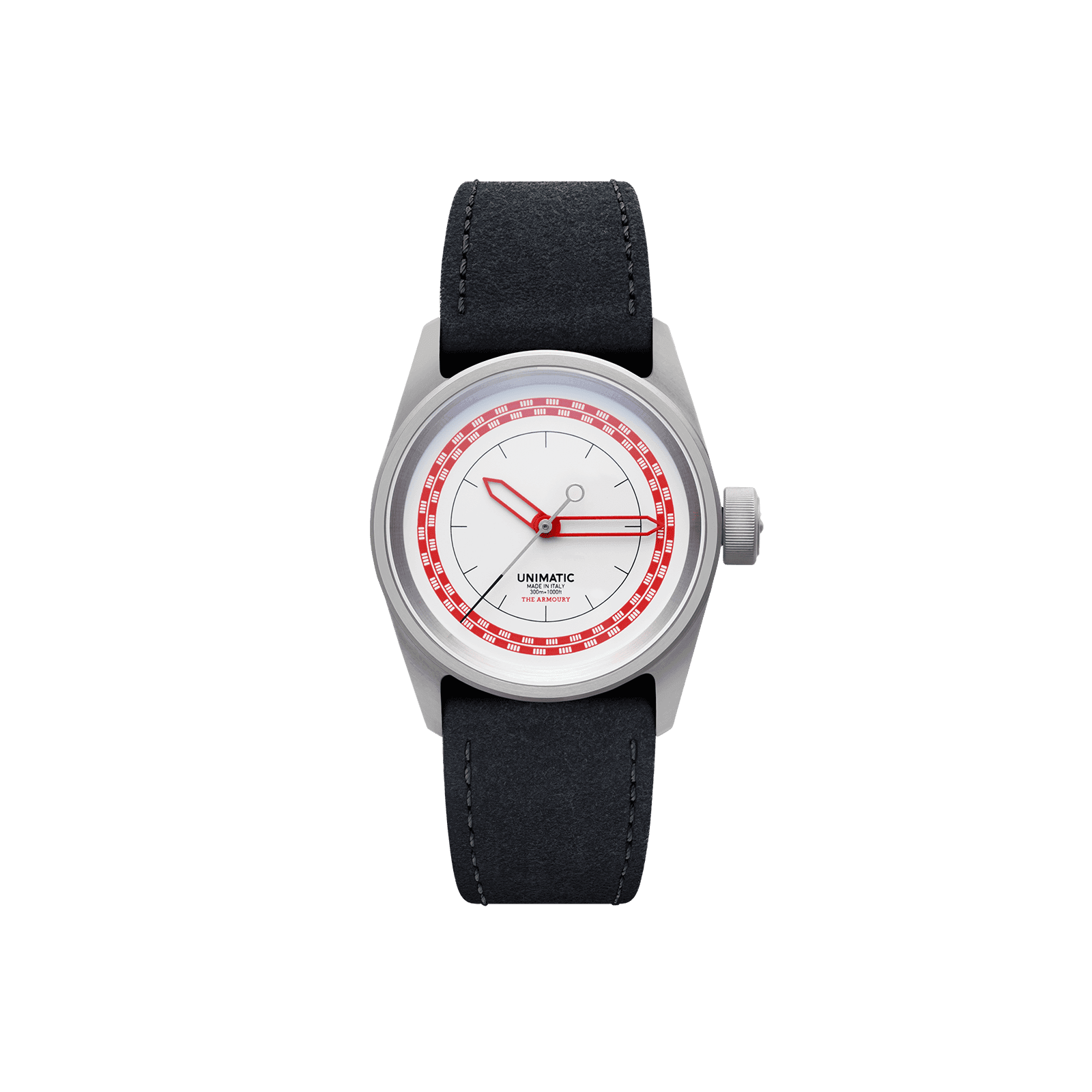 The engraved caseback celebrates UNIMATIC x The Armoury Anniversary. Covered by a 24-month worldwide warranty, this limited edition of 120 pieces is a collector’s luxury Italian watch for enthusiasts.