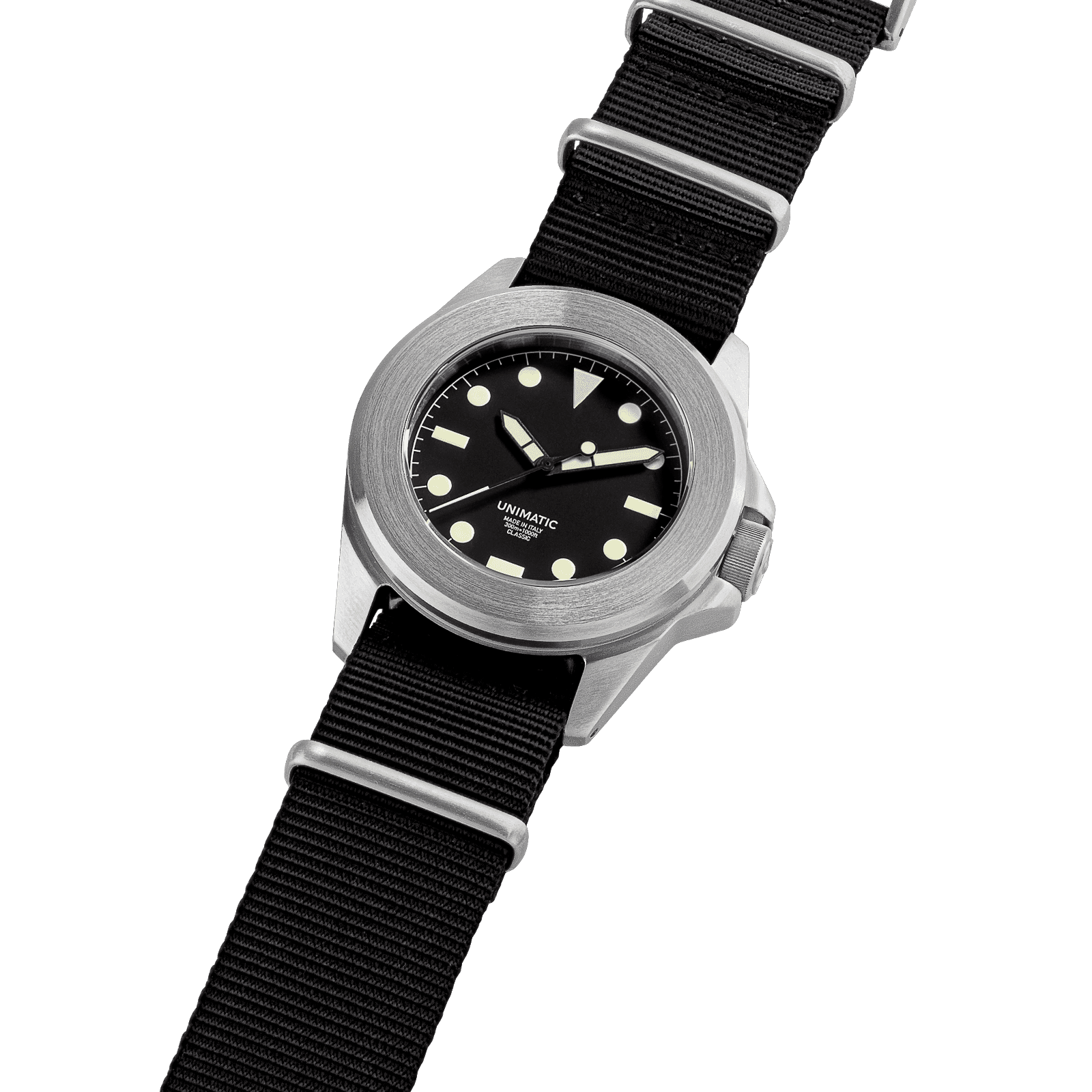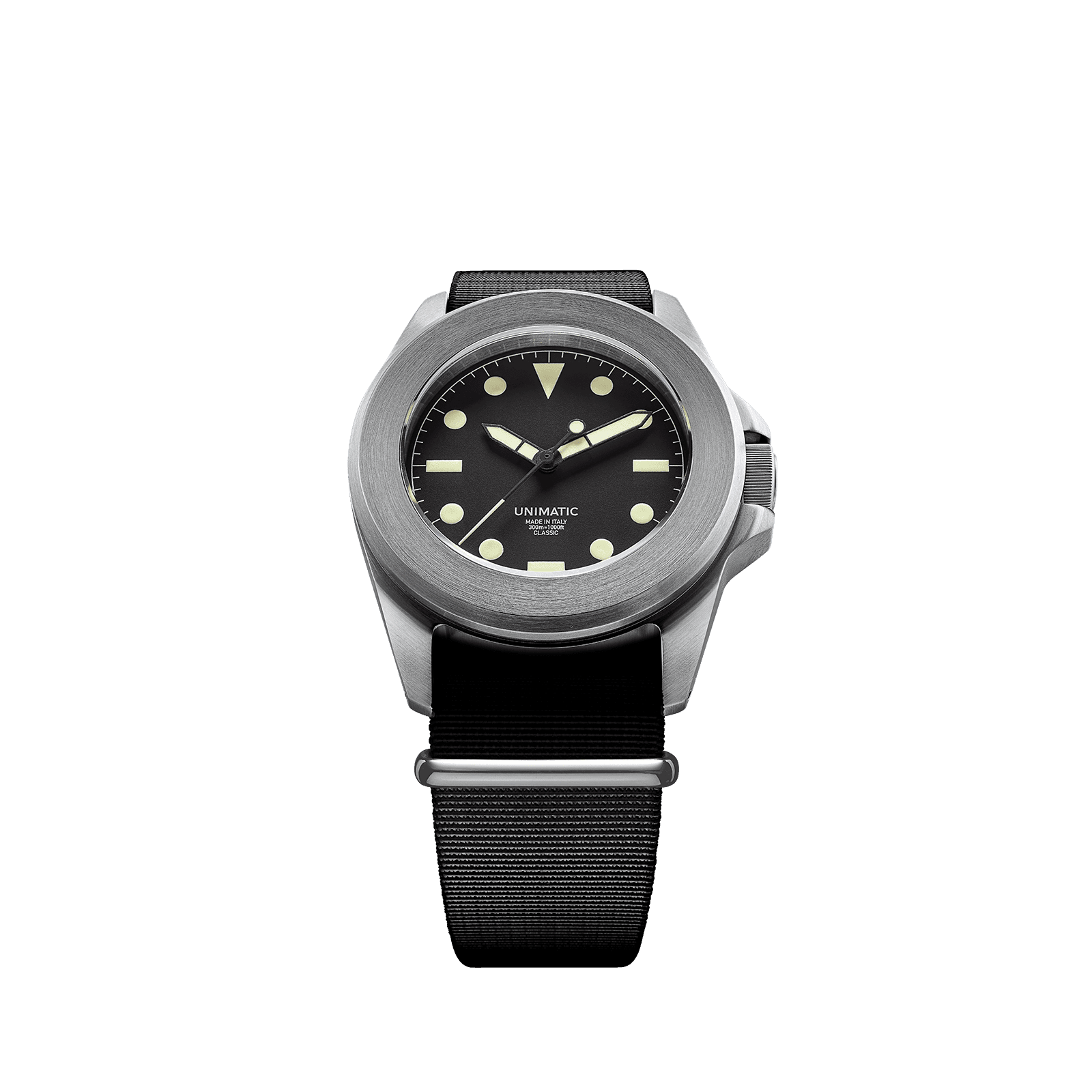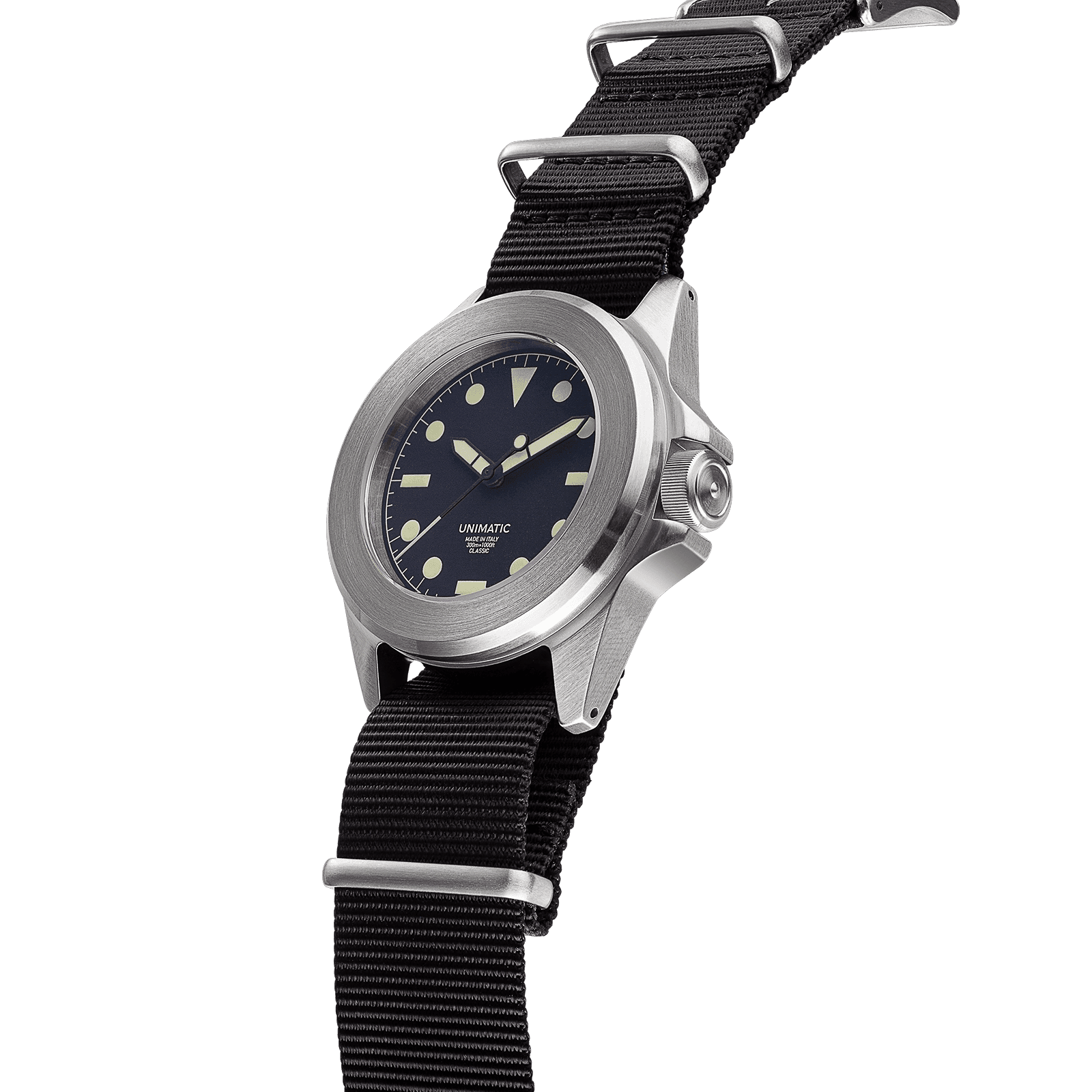 The UNIMATIC high legibility classic dial is a study in purposeful clarity. Featuring big geometric hour markers, a clean minute track, and a stark contrast between dial and lume, it’s designed for instant readability in any condition.