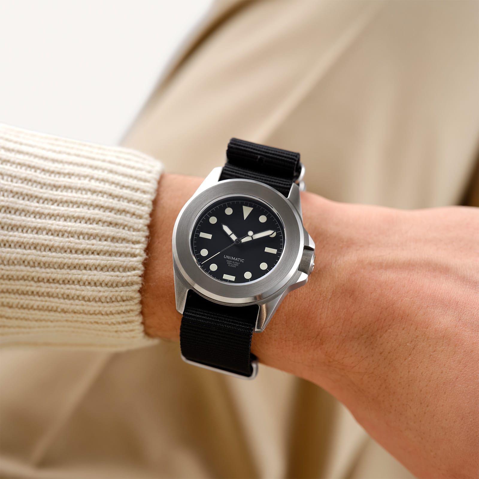 UNIMATIC’s classic diver design is a modern reinterpretation of timeless tool-watch aesthetics — stripped down to essentials with bold legibility, clean geometry, and a utilitarian edge. Characterized by its oversized crown, stark dial with luminous markers, and unidirectional bezel, it channels vintage military influences while embracing contemporary minimalism.