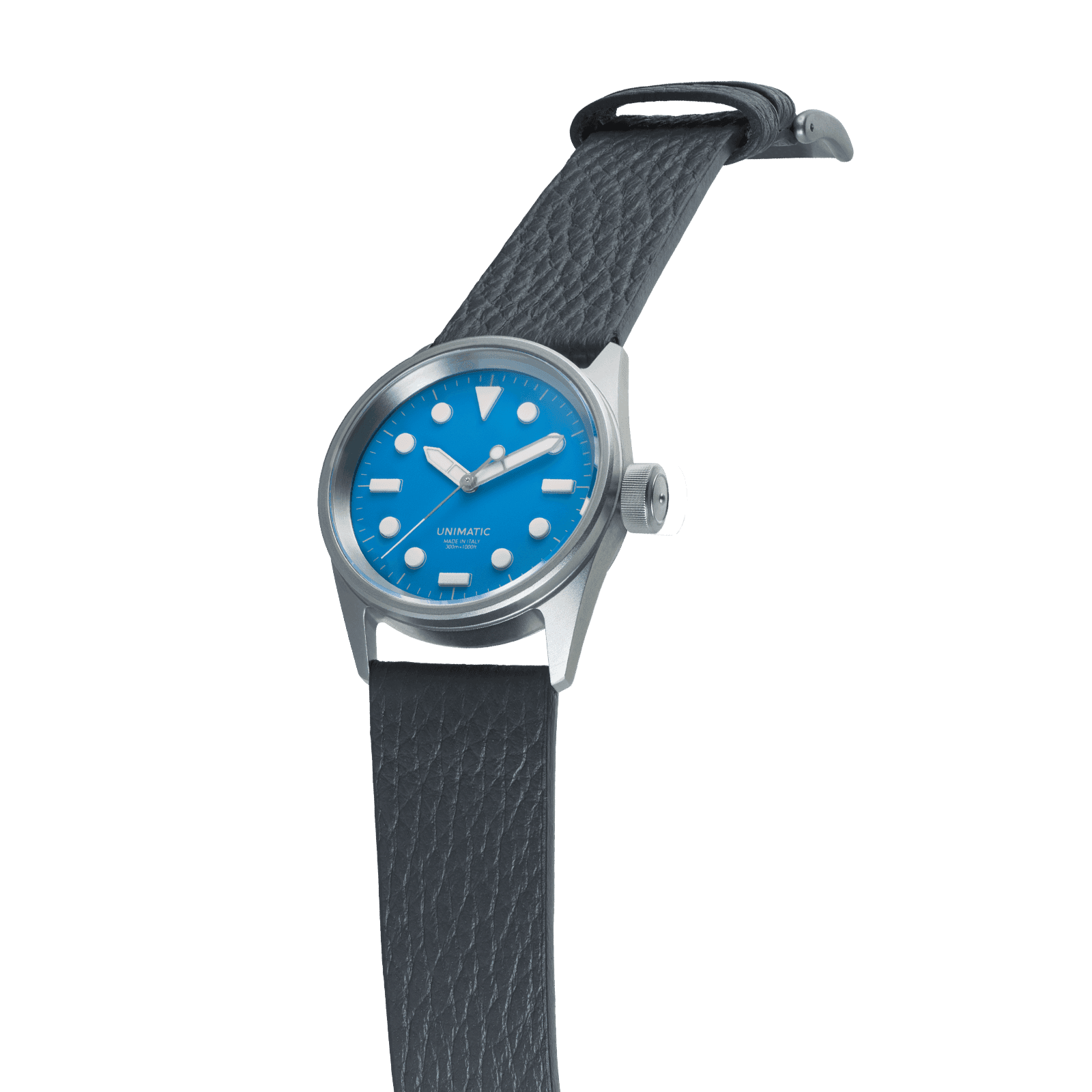Timing accuracy is guaranteed by the Quartz VH31A movement with hacking second hand, fitted with a Made in Italy TPU anti-shock system. The watch comes on a fumo deer leather two-piece quick-release strap with sandblasted stainless steel hardware signed UNIMATIC, fitting 22mm lugs.
